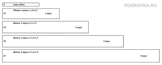 Часто обходятся без построения вообще, выполняя крой непосредственно на ткани. Мерка с фигуры – обхват бедер – используется лишь для определения ширины первого яруса, ширина остальных ярусов рассчитывается исходя из первого. Высота ярусов зависит от их количества и общей длины юбки.