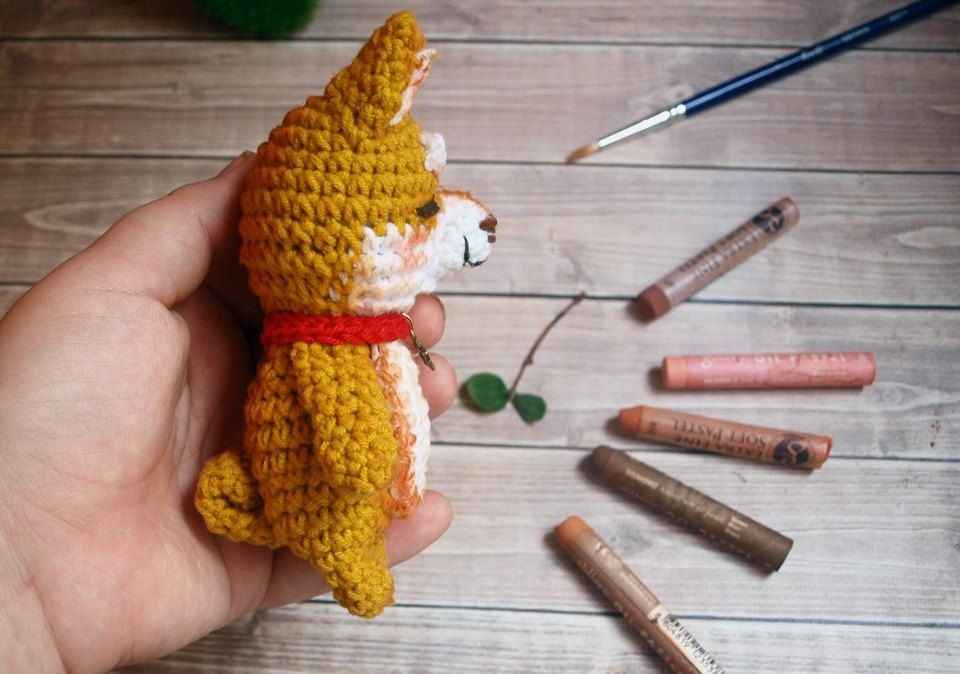 Хвост Коричневой пряжей: Вяжем сбн за зпп. Вначале вязания оставляем длинный хвостик, в процессе вязания оставляем его снаружи. 1) 4 сбн в к.а. 2) 4 сбн 3) (пр, 1 сбн)*2 = 6п 4) 6 сбн 5) (пр, 2 сбн)*2 = 8п 6) 8 сбн Обрезаем нить и прячем внутрь хвоста. Вдеваем хвостик нити, который оставляли вначале вязания, в иглу и продеваем её под ппп всех рядов вдоль хвоста до конца вязания, стягиваем немного, чтоб наш хвост закрутился. Закрепляем нить, пришиваем хвост на уровне 7-8 ряда, примерно по центру.